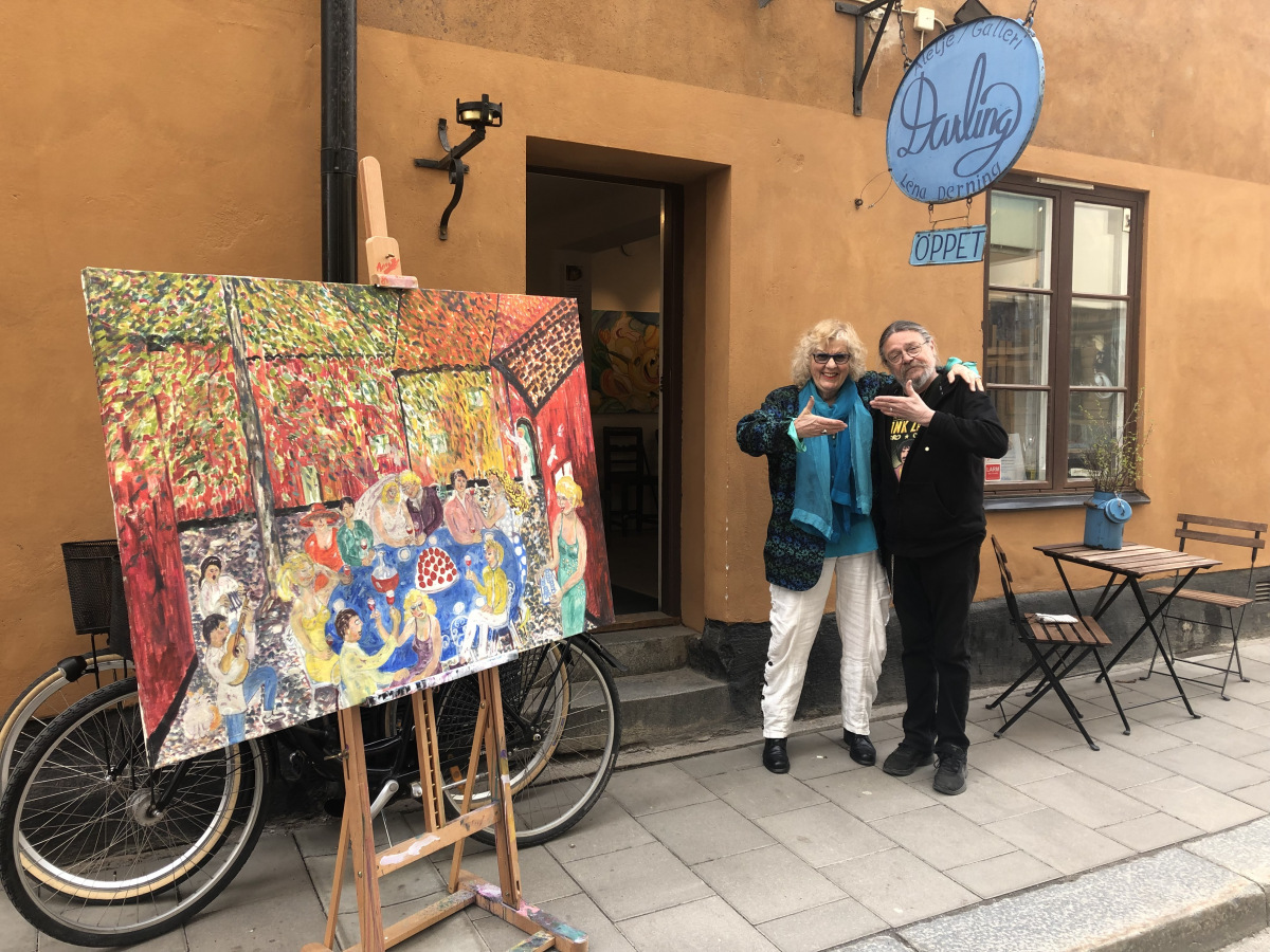 Lena Derning och Benny Erlandsson med Lenas målning Bröllop på innergården, olja på duk, utanför Galleri Darling