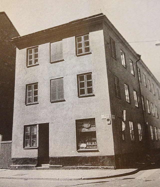 Till vänster ses en gammal svartvit bild av byggnaden som inrymmer Galleri Darling. Byggnaden heter BONDEN STÖRRE 45 (f.d. Bonden större 13, 23, 24), Södermannagatan 28, 30, 32, Skånegatan 69.
