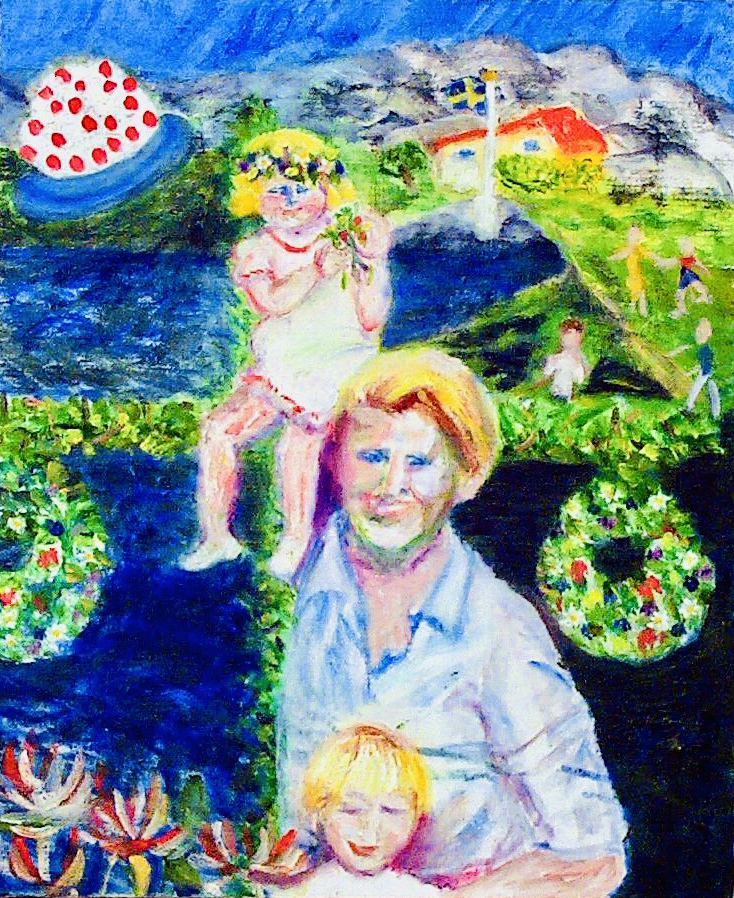 Här tillbringade jag alla mina somrar från det jag var fem år och i ett halvt århundrade! Föddes en midsommarafton på fyrtiotalet bland blåklint, prästkragar och klöver! Inte konstigt då att jag blev ett obotligt romantiskt barn och att många av mina målningar handlar just om detta: Dans runt midsommarstången och jordgubbstårtor. Ty det var så jag blev firad under alla år. Mina tre bröder och jag lärde oss från tidig ålder att segla över sundet och hämta mjölken i en plåtspann hos bondgården snett emot. Smällande segel, och båtar på det blåa Havet!